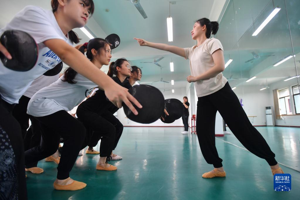 在長(cháng)沙職業(yè)技術(shù)學(xué)院特殊教育學(xué)院的舞蹈房里,鄧蕓虹(右一)帶著(zhù)學(xué)生排練舞蹈《信仰的力量》(9月7日攝)。