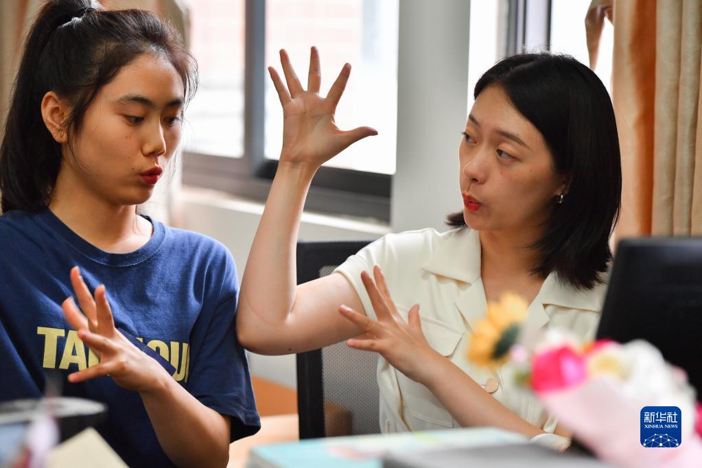 在長(cháng)沙職業(yè)技術(shù)學(xué)院特殊教育學(xué)院,鄧蕓虹(右)在溫習手語(yǔ)表達(9月7日攝)。