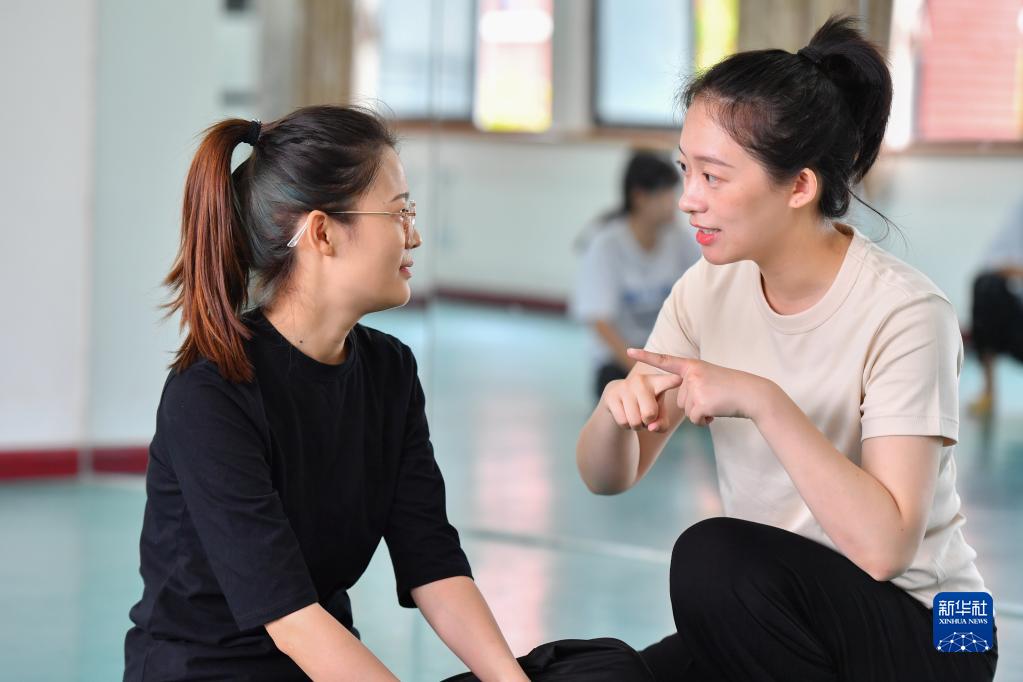 在長(cháng)沙職業(yè)技術(shù)學(xué)院特殊教育學(xué)院的舞蹈房里,鄧蕓虹(右)用手語(yǔ)和學(xué)生交流舞蹈要領(lǐng)(9月7日攝)。