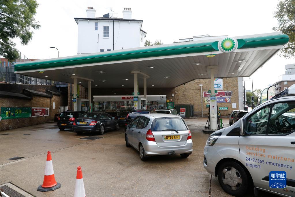 9月27日,車(chē)輛排隊駛入英國倫敦一家加油站加油。新華社記者 韓巖 攝