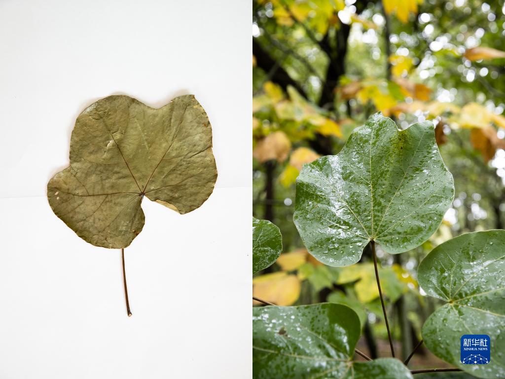 這是10月10日在昆明植物園拍攝的云南梧桐。這張拼版照片分別為科研人員野外采集的標本(左)和在植物園遷地保護后存活下來(lái)的同種植物。