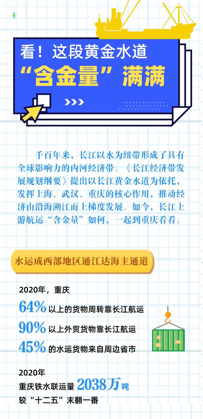 “在綠色發(fā)展理念指引下,長(cháng)江已成為重慶乃至西部地區通江達海的主通道?!敝貞c市交通局相關(guān)負責人表示,去年,重慶水運貨運周轉量占綜合交通貨物周轉量的64%以上,而重慶港中轉的貨物中45%來(lái)自周邊省市,“更重要的是,重慶外貿貨物中的90%以上都通過(guò)長(cháng)江航運出海?!?/p>