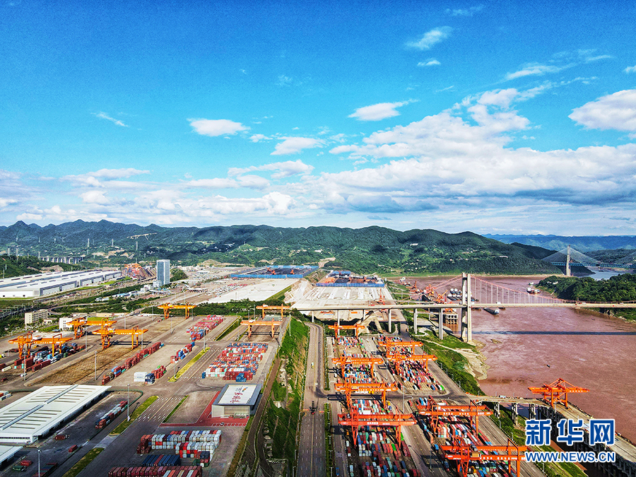 無(wú)人機視角下的長(cháng)江上游最大鐵公水聯(lián)運港果園港。新華網(wǎng)發(fā)