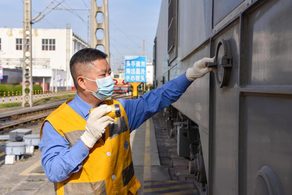 11月23日,胡勇在接車(chē)后檢查機車(chē)走行部。新華社記者胥冰潔攝