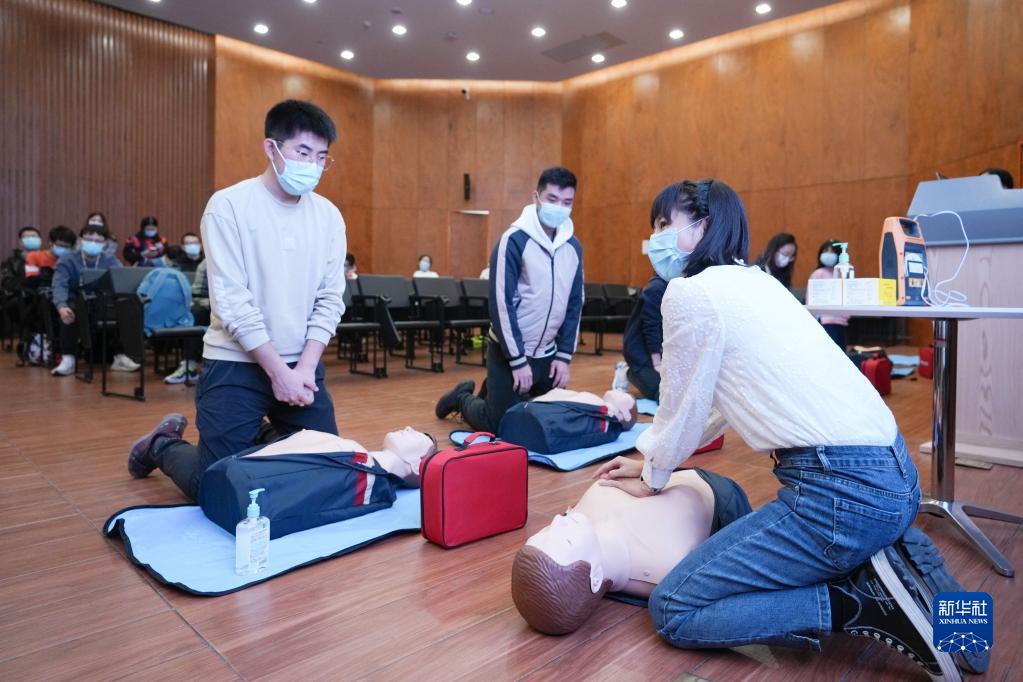 11月28日,清華大學(xué)醫院醫生李晶鈴(右一)在為學(xué)生志愿者講授心肺復蘇術(shù)。新華社記者 鞠煥宗 攝