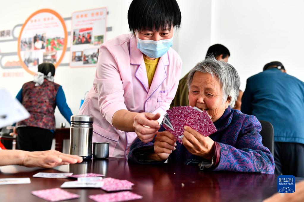 在山東省東營(yíng)市墾利區楊廟社區養老服務(wù)中心,工作人員陪老人打撲克(10月18日攝)。新華社記者 郭緒雷 攝