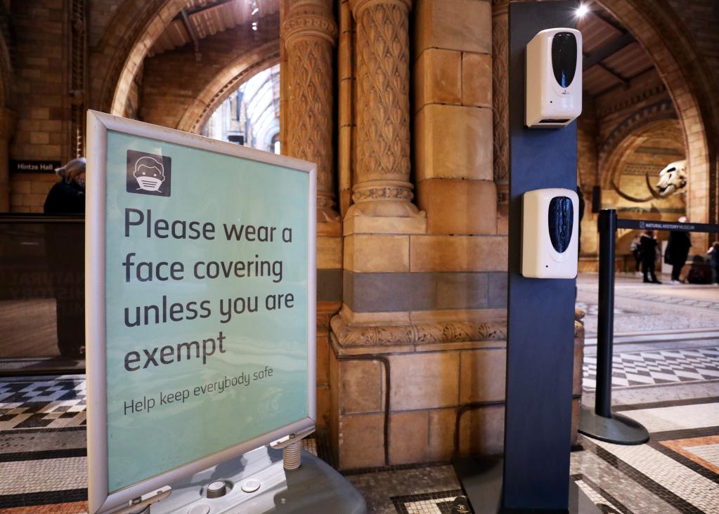 這是12月18日在英國倫敦自然歷史博物館門(mén)口拍攝的提醒人們佩戴口罩的提示牌。(新華社記者李穎攝)