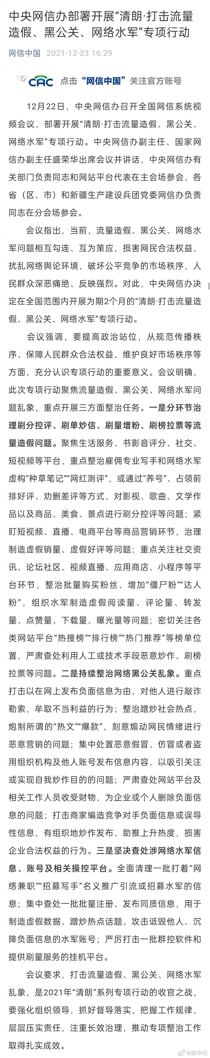 中央網(wǎng)信辦22日召開(kāi)全國網(wǎng)信系統視頻會(huì )議,指出當前流量造假、黑公關(guān)、網(wǎng)絡(luò )水軍問(wèn)題相互勾連、互為策應,損害網(wǎng)民合法權益,擾亂網(wǎng)絡(luò )輿論環(huán)境,破壞公平競爭的市場(chǎng)秩序,人民群眾深?lèi)和唇^、反映強烈。對此,中央網(wǎng)信辦決定在全國范圍內開(kāi)展為期2個(gè)月的“清朗·打擊流量造假、黑公關(guān)、網(wǎng)絡(luò )水軍”專(zhuān)項行動(dòng)。(記者 余俊杰)