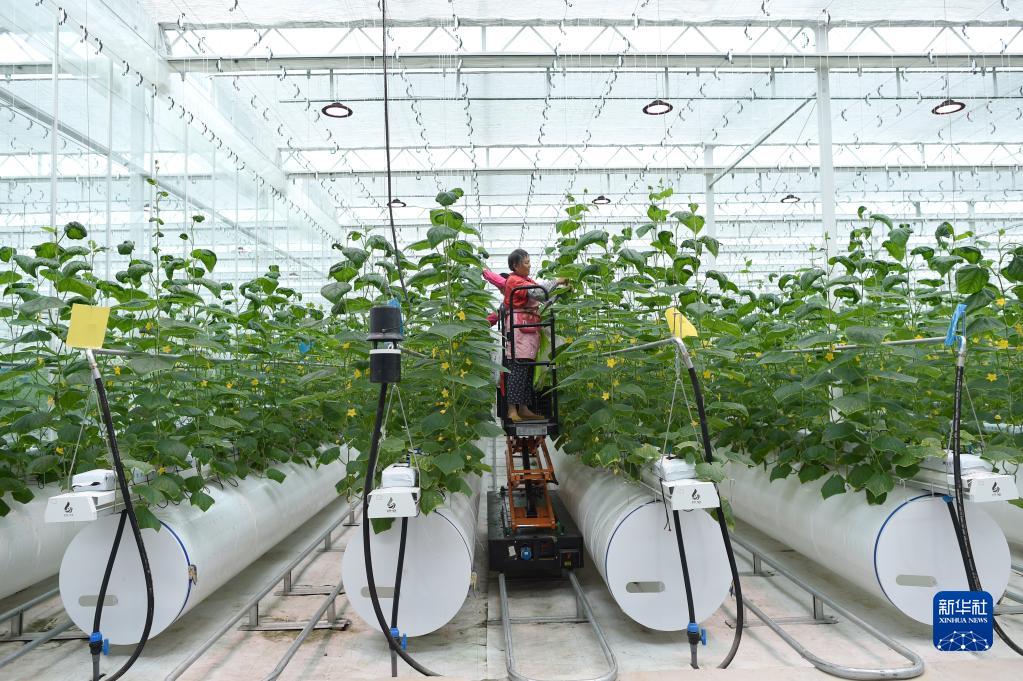9月16日,工作人員在浙江省嘉興市一家農業(yè)數字化工廠(chǎng)的種植車(chē)間內乘軌道升降車(chē)對蔬菜進(jìn)行日常管理。新華社記者 韓傳號 攝
