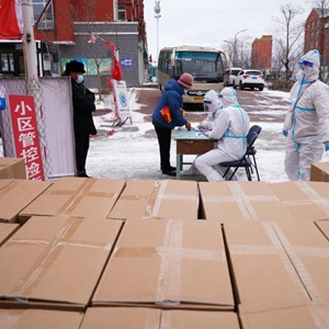 在黑龍江省黑河市愛(ài)輝區一小區,社區工作人員為居民發(fā)放免費生活物資(11月10日攝)。新華社記者 王松 攝