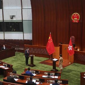 11時(shí)許,林鄭月娥步入會(huì )議廳,和全體議員高唱國歌。隨后,議員們逐一上前,面向林鄭月娥宣讀誓詞。