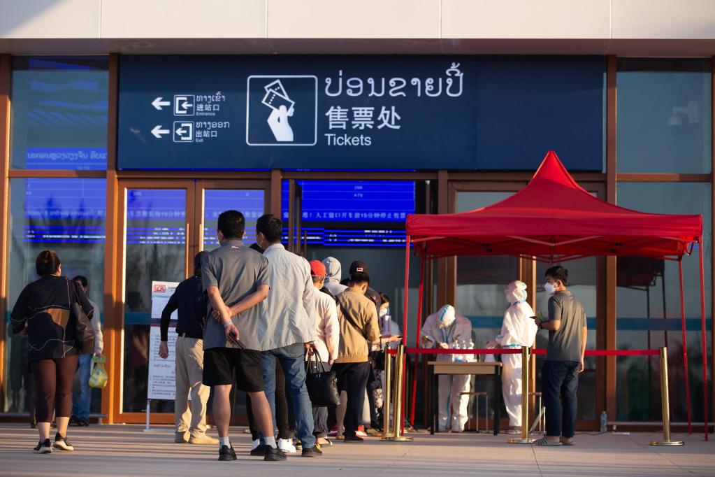 2021年12月12日,旅客在中老鐵路萬(wàn)象站排隊買(mǎi)票。(新華社記者章建華攝)