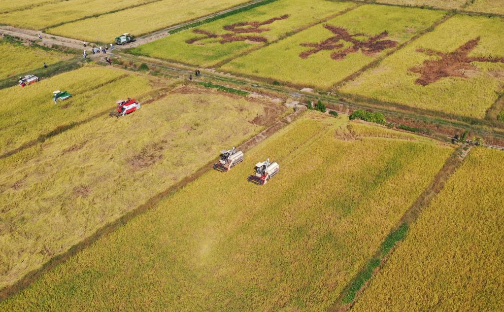 圖為2021年9月22日,在湖南省衡陽(yáng)市衡陽(yáng)縣庫宗橋鎮,農機手駕駛農機收割稻谷(無(wú)人機照片)。 新華社記者趙眾志 攝