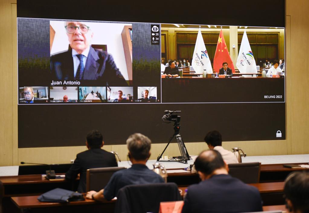 國際奧委會(huì )副主席、北京冬奧會(huì )協(xié)調委員會(huì )主席胡安·安·薩馬蘭奇(左上)通過(guò)視頻形式參加會(huì )議。新華社記者張晨霖攝