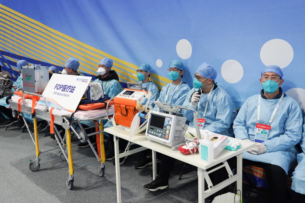 2021年4月,五棵松體育中心“相約北京”冰上項目測試活動(dòng),醫護人員在場(chǎng)館內的FOP醫療站待命。新華社記者彭子洋攝