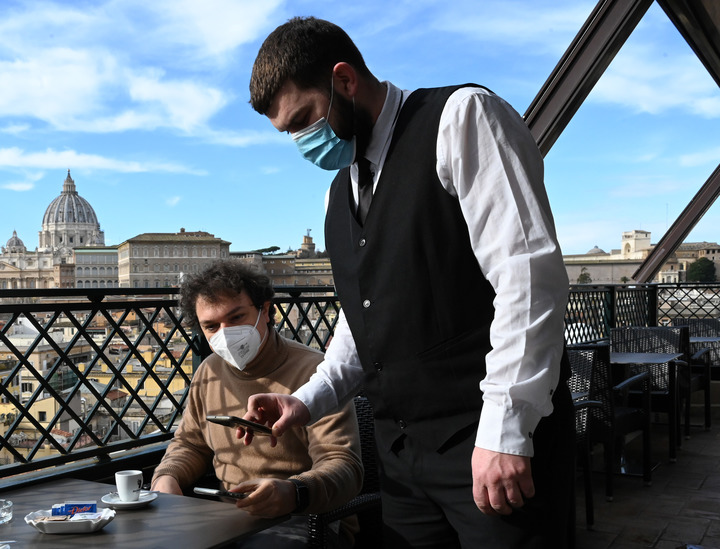1月10日,意大利羅馬一家酒店的餐廳區域員工檢查一名男子的加強版“綠色通行證”。新華社發(fā)(阿爾貝托·林格利亞攝)