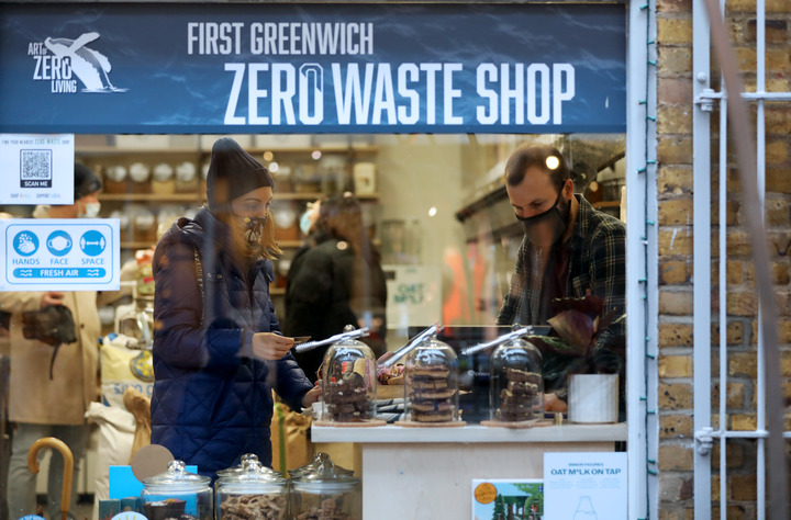 1月8日,人們佩戴口罩在英國倫敦一處市場(chǎng)購物。新華社記者李穎攝