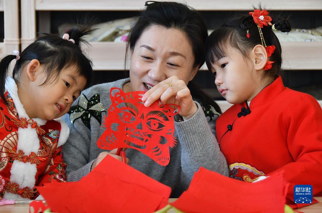 1月13日,山東省煙臺市福山區實(shí)驗幼兒園的小朋友學(xué)剪窗花。