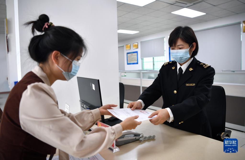 2022年1月1日,海關(guān)工作人員(右)發(fā)放海南首份RCEP原產(chǎn)地證書(shū)。新華社記者 郭程 攝