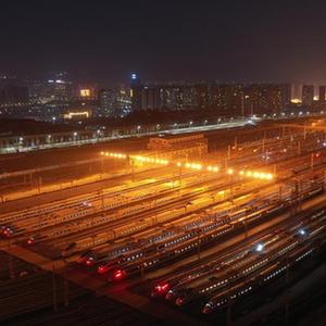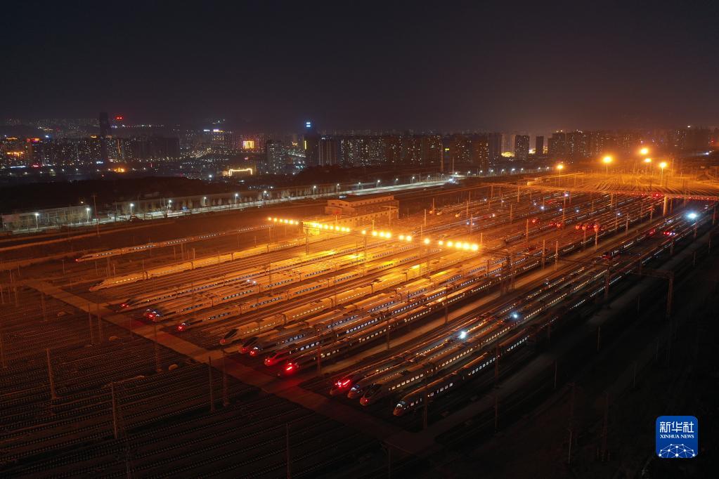1月16日晚,動(dòng)車(chē)組列車(chē)??吭谥袊F路蘭州局集團有限公司蘭州車(chē)輛段蘭州西動(dòng)車(chē)運用所整備場(chǎng)上,為1月17日開(kāi)始的2022年春運做好準備(無(wú)人機照片)。新華社記者 杜哲宇 攝