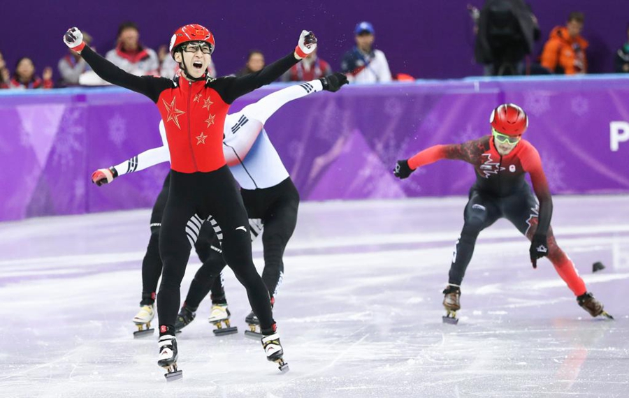 2018年2月22日,在平昌冬奧會(huì )短道速滑男子500米決賽中,中國選手武大靖奪冠后慶祝。新華社記者 韓巖 攝