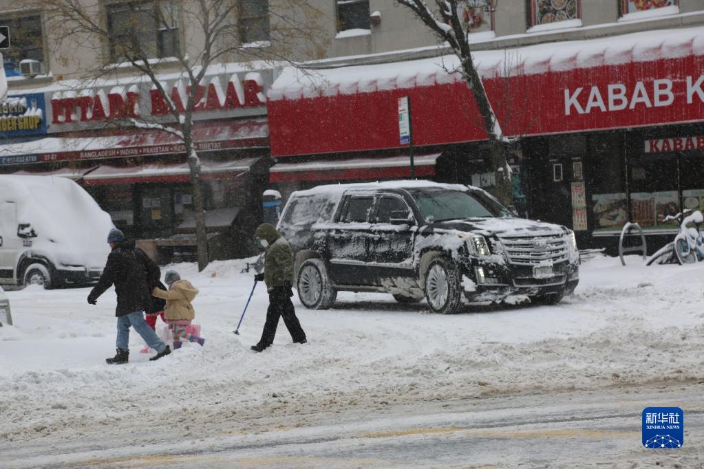 1月29日,在美國紐約,行人穿過(guò)積雪的街道。