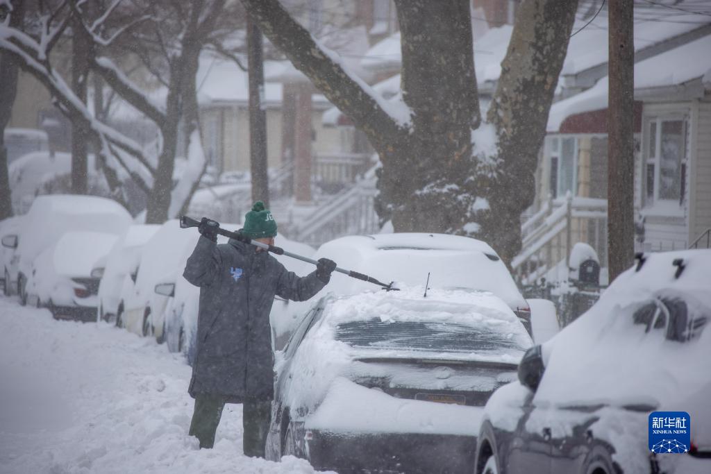 1月29日,美國紐約一名居民清理汽車(chē)上的積雪。