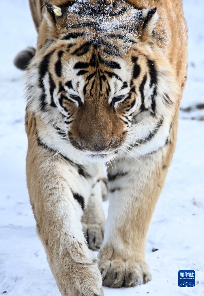 1月13日,在吉林省東北虎園內,一只東北虎在雪地上踱步。