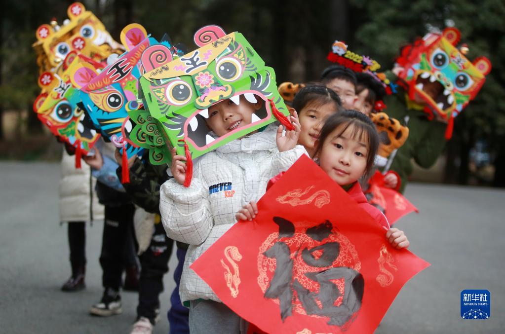 1月22日,在江蘇省揚州市茱萸灣風(fēng)景區,小朋友手持福字和虎頭帽為游客送上新春祝福。