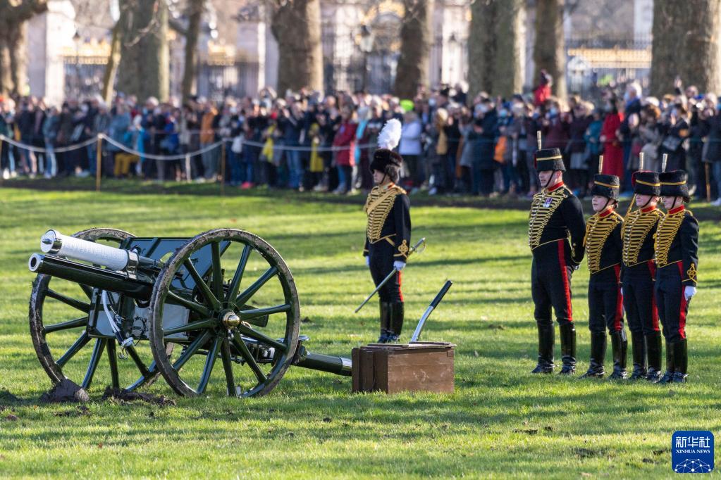 2月7日,英國士兵在倫敦白金漢宮旁的格林公園鳴放禮炮,慶祝女王伊麗莎白二世登基70周年。
