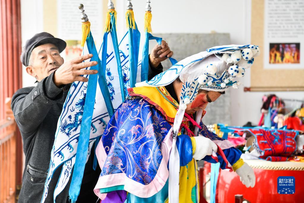 2月6日,龍里太平花燈戲藝人趙應明(左)在給戲班成員整理行頭。