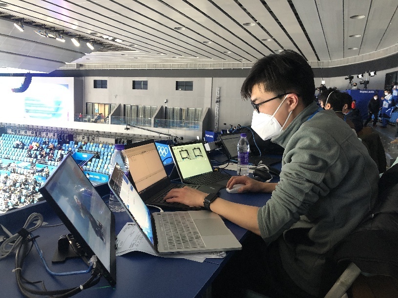早在1月,新華社攝影團隊和技術(shù)團隊的施工人員就進(jìn)入奧運閉環(huán),在首都體育館吊裝的桁架上安裝了2臺遙控云臺相機,其中一臺位于場(chǎng)地中心主形象景觀(guān)正上方,另一臺位于短道終點(diǎn)正上方。兩臺相機各有側重又互相補充,基本可以無(wú)死角覆蓋場(chǎng)內的各個(gè)角度。與手持相機拍攝的最大不同是遙控云臺相機需要使用電腦軟件控制,對于調整角度和曝光等操作要求更復雜。5日下午5點(diǎn),雖然距離晚場(chǎng)開(kāi)賽還有兩個(gè)多小時(shí),各路記者已經(jīng)將首都體育館本就不大的媒體工作間圍得水泄不通。抵達場(chǎng)館后,我抓緊時(shí)間趕到看臺最高層的遙控云臺相機操控席位調試設備,競賽區域從這里看去一覽無(wú)余,對于操作遙控云臺相機來(lái)說(shuō)是最好不過(guò)。