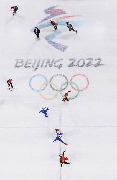 ↑2月5日,中國隊選手武大靖(下)在比賽中沖過(guò)終點(diǎn)。當日,北京2022年冬奧會(huì )短道速滑項目混合團體接力決賽在首都體育館舉行。新華社記者 徐子鑒 攝