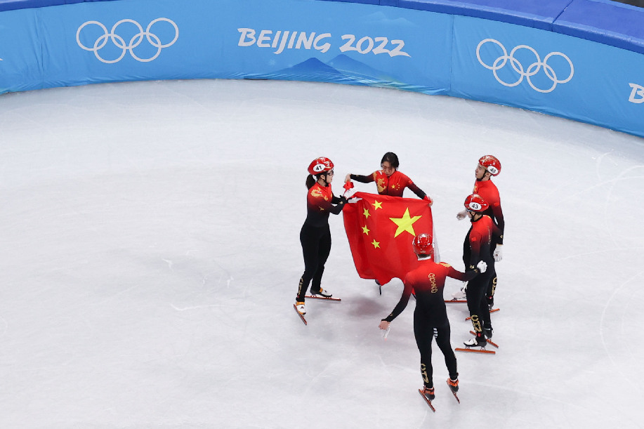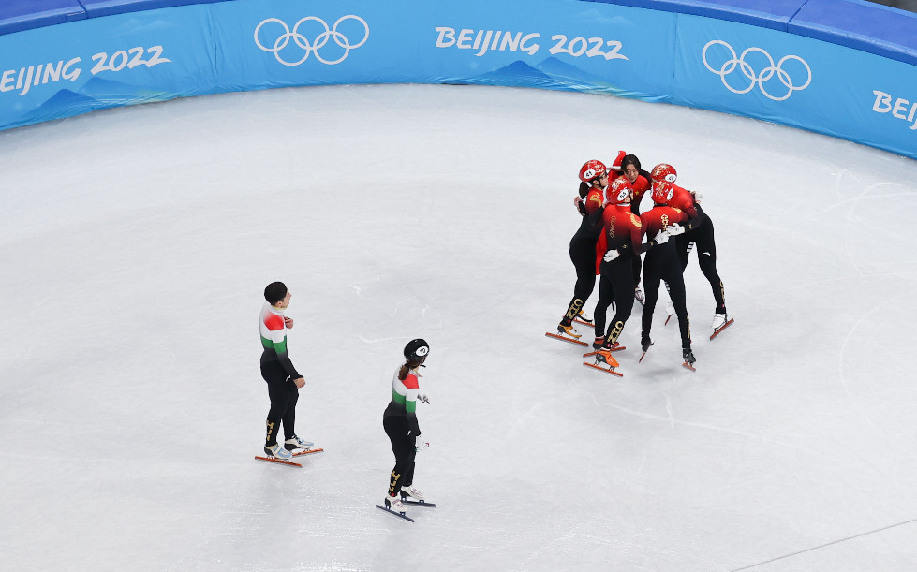 ↑2月5日,中國隊選手在短道速滑項目混合團體接力決賽比賽后慶祝。?新華社記者 徐子鑒 攝
