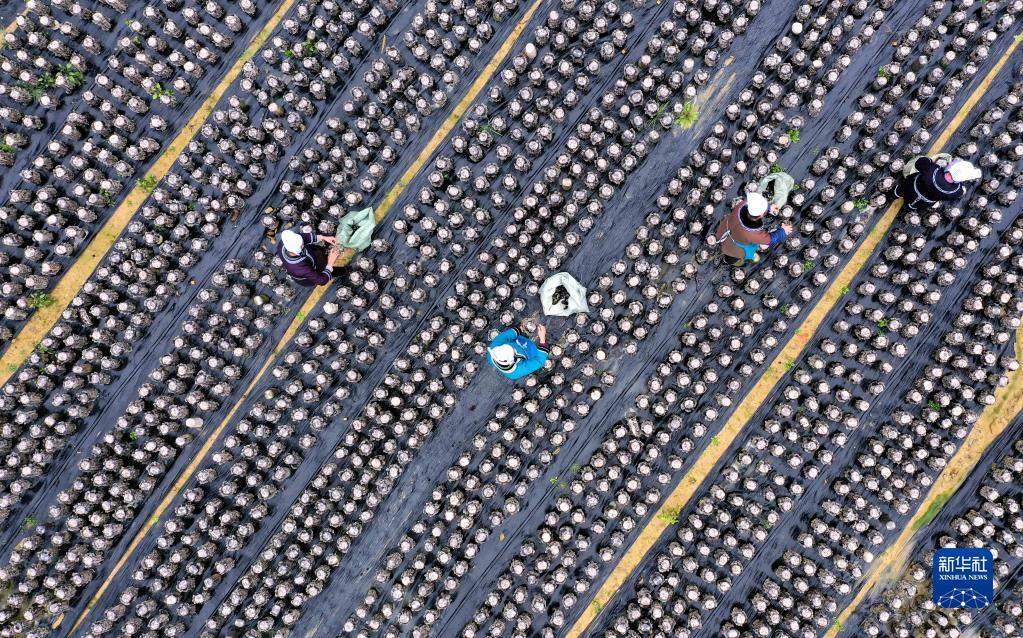 2月11日,村民在貴州省黔東南苗族侗族自治州榕江縣興華水族鄉高舊村采摘黑木耳(無(wú)人機照片)。