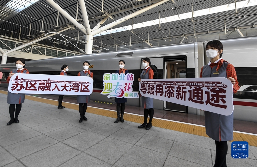 沐浴著(zhù)虎年的陽(yáng)光,開(kāi)通不久的贛深高鐵上,一列列火車(chē)飛馳而過(guò)。