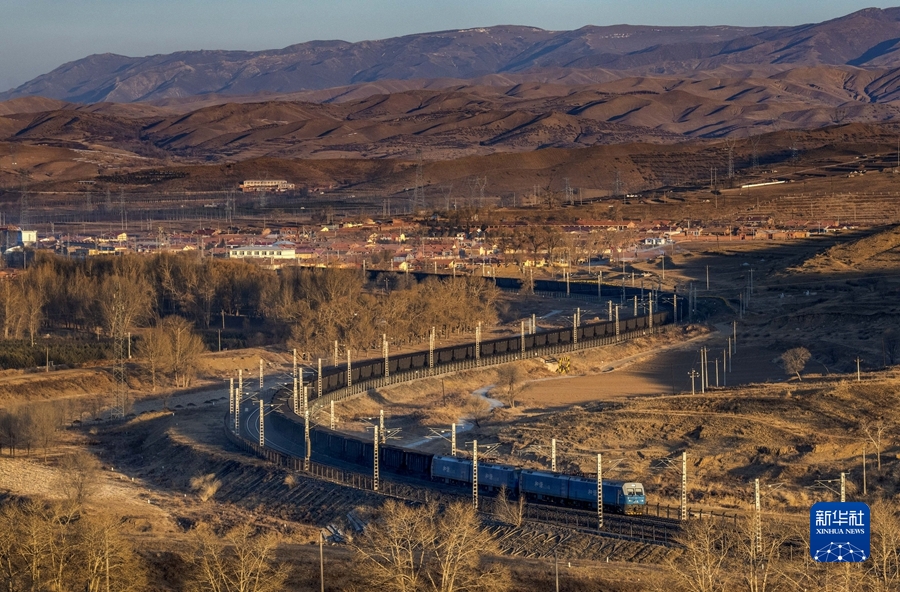 2021年12月23日,一列萬(wàn)噸煤炭列車(chē)行駛在內蒙古烏蘭察布市卓資縣境內。新華社發(fā)(紀恩泉 攝)