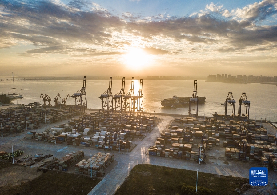 這是2021年12月5日清晨在海南洋浦經(jīng)濟開(kāi)發(fā)區拍攝的海南自貿港建設重要的集裝箱航運樞紐——洋浦國際集裝箱碼頭(無(wú)人機照片)。新華社記者 蒲曉旭 攝