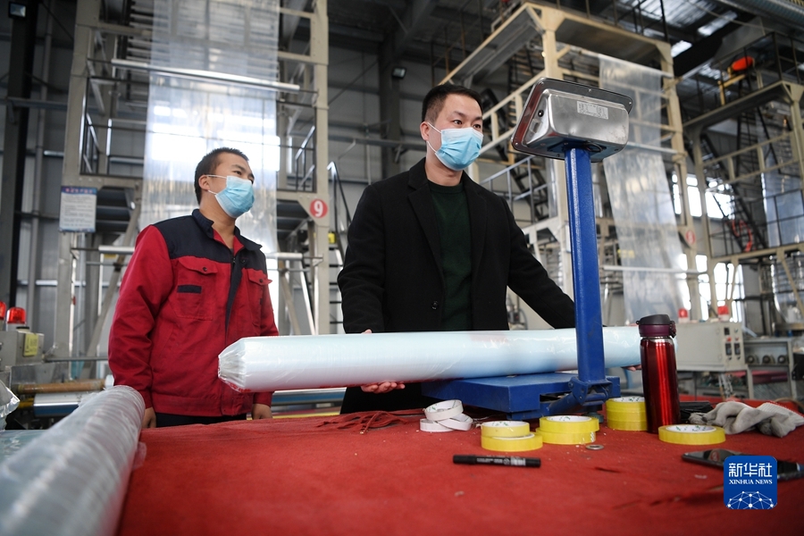 2022年1月28日,閩商鄭開(kāi)煌(右)在位于寧夏隆德縣閩寧扶貧產(chǎn)業(yè)園的農用薄膜生產(chǎn)線(xiàn)查看產(chǎn)品質(zhì)量。新華社記者 王鵬 攝