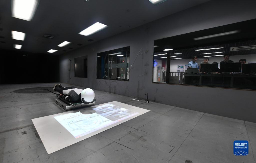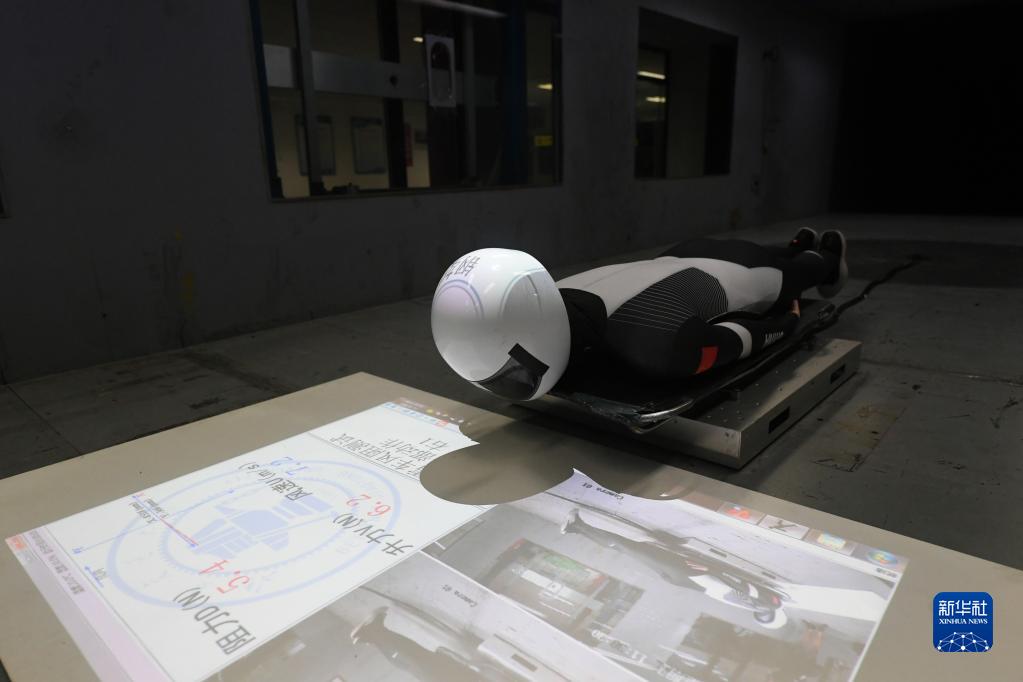 在北京交通大學(xué)風(fēng)洞實(shí)驗室,風(fēng)洞輔助訓練系統顯示的信息將運動(dòng)速度、運動(dòng)風(fēng)阻力、運動(dòng)姿態(tài)及測試指令實(shí)時(shí)反饋給測試人員(2021年7月16日攝)。新華社記者 任超 攝