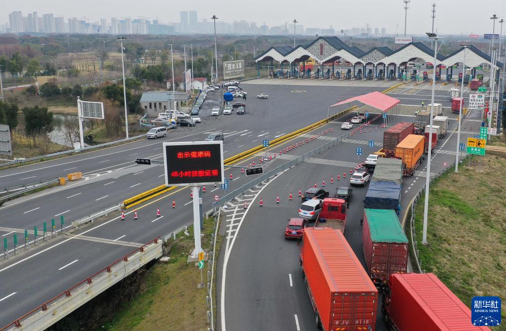 2月15日,車(chē)輛在京滬高速公路蘇州新區收費站接受查驗(無(wú)人機照片)。