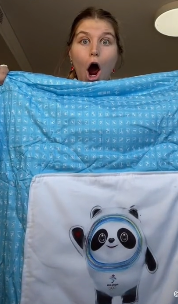 美國運動(dòng)員展示“冰墩墩”毯子(網(wǎng)絡(luò )視頻截屏)