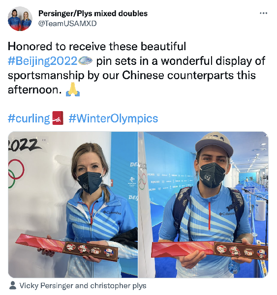 “冬奧朋友圈”展現出了中國選手與其他國家運動(dòng)員惺惺相惜的珍貴友情。在冰壺混雙循環(huán)賽第八輪比賽中,中國冰壺混雙組合凌智和范蘇圓不敵美國組合維多利亞·珀辛格和克里斯托弗·普利斯。賽后,凌智和范蘇圓向對方贈送“冰墩墩”奧運紀念徽章,美國選手驚喜地接過(guò)禮物,四人合影留念。美國選手隨后在社交媒體賬戶(hù)上曬出收獲禮物的照片,并寫(xiě)道:“非常榮幸收到這些精美的北京冬奧會(huì )徽章,我們的中國同行精彩地展現了體育精神?!泵绹爢T賽后在更衣室也向凌智和范蘇圓回贈了徽章。