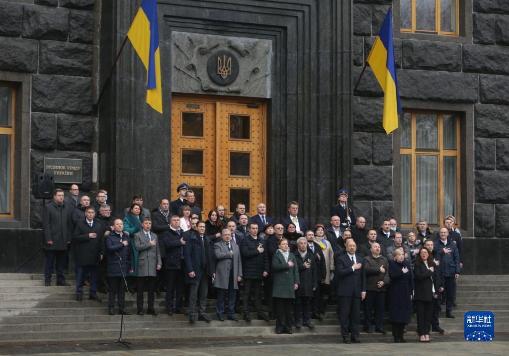 2月16日,在烏克蘭首都基輔,烏克蘭內閣成員在烏政府辦公大樓前參加團結日慶?;顒?dòng)。