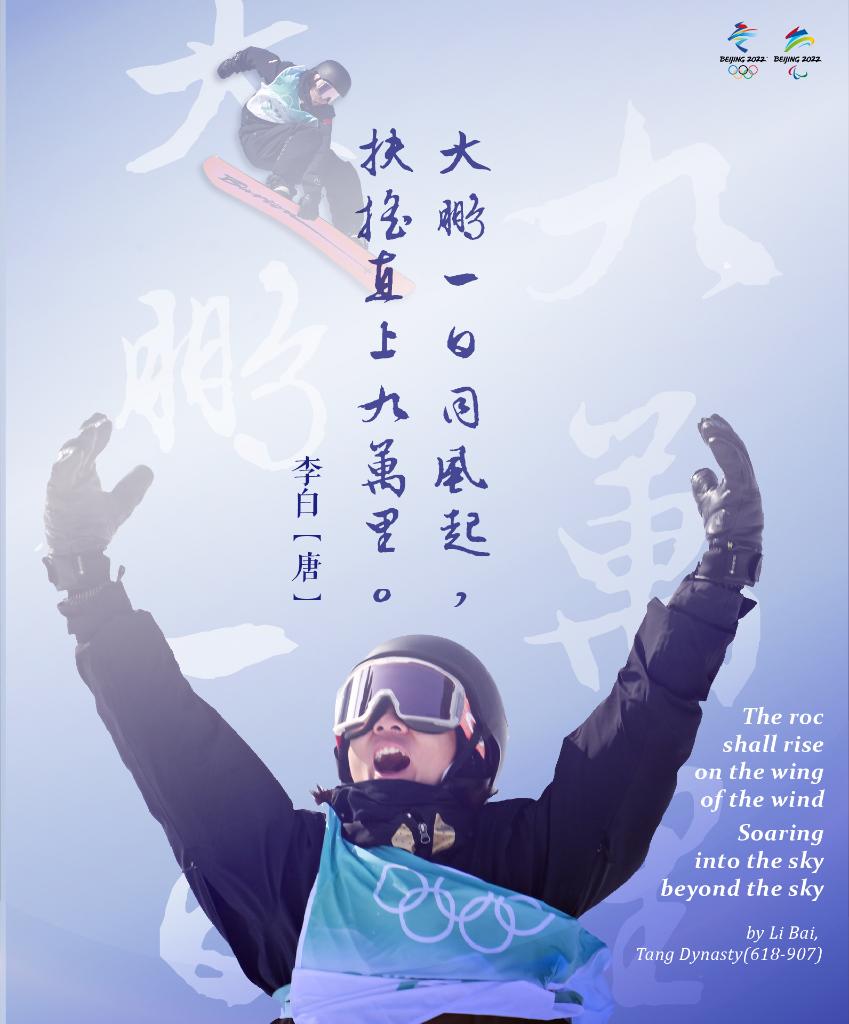 蘇翊鳴獻上兩跳幾乎完美的轉體1800度的動(dòng)作后,提前鎖定單板滑雪男子大跳臺金牌,成為中國首個(gè)單板滑雪冬奧冠軍,也是中國最年輕的冬奧冠軍。面對這個(gè)即將年滿(mǎn)十八歲的少年,一向灑脫不羈的李白想必要擊節贊嘆:“大鵬一日同風(fēng)起,扶搖直上九萬(wàn)里?!?/font>