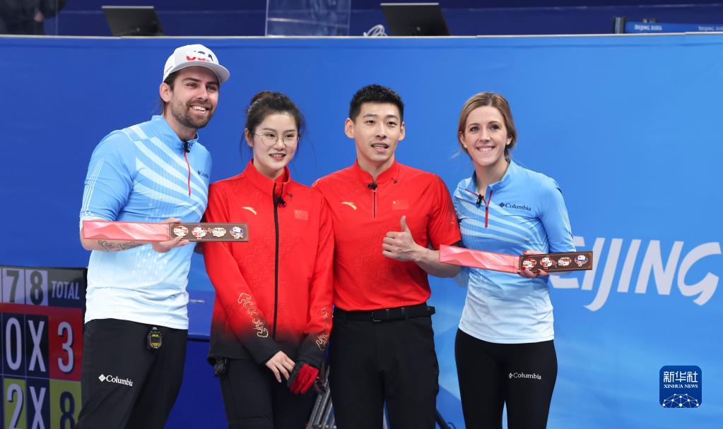 在國家游泳中心“冰立方”與美國隊比賽結束后,中國冰壺混雙隊范蘇圓、凌智分別拿出一組“冰墩墩”奧運紀念徽章,贈送給美國隊員克里斯托弗·普利斯和維多利亞·珀辛格。次日,中國組合在回到更衣室后也收到了美國隊回贈的徽章。