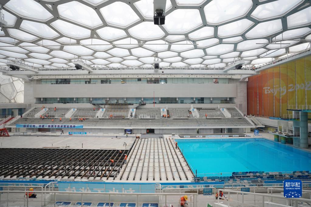 這是2019年7月10日拍攝的在進(jìn)行冰場(chǎng)可轉換結構施工的“水立方”。新華社記者 鞠煥宗 攝