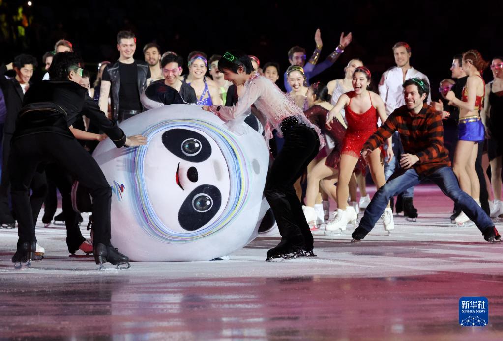 2月20日,“冰墩墩”不小心摔倒后,選手們紛紛上前幫忙。當日,北京2022年冬奧會(huì )花樣滑冰表演滑在首都體育館舉行。新華社記者 張玉薇 攝