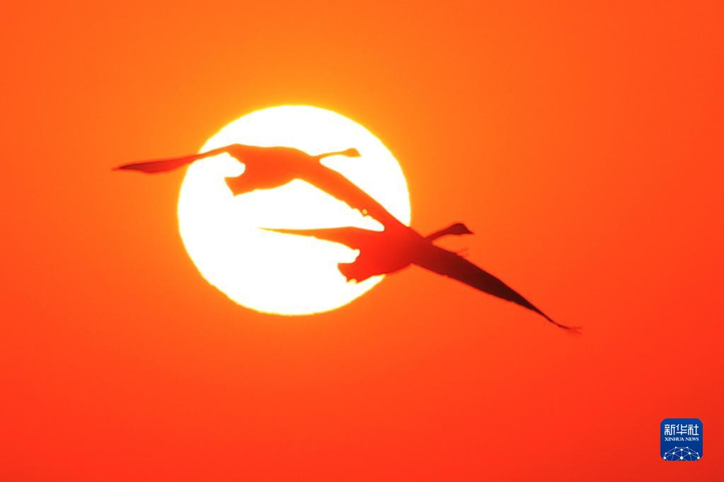 2月24日清晨,在山東榮成天鵝湖畔,兩只大天鵝映著(zhù)日出飛翔。