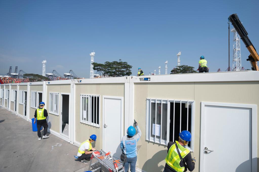 2月26日,工作人員在青衣方艙醫院施工。新華社記者 呂小煒 攝